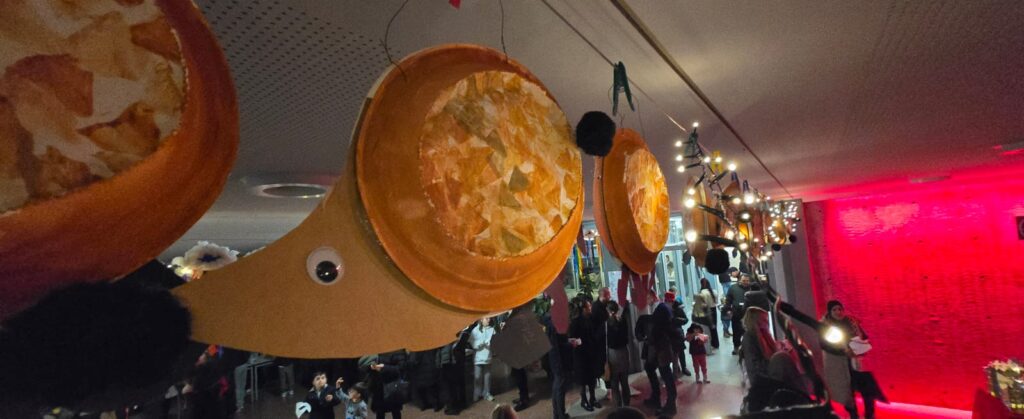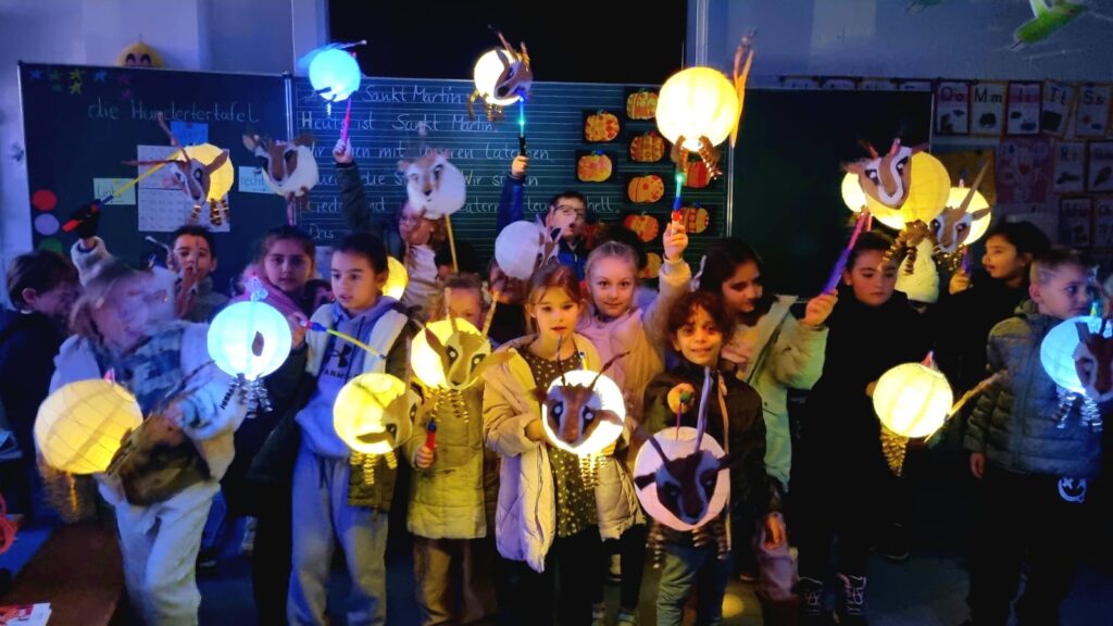 klang es auch dieses Jahr wieder durch die Schule. Zuvor hatten die Klassen eifrig an ihren Laternen gebastelt, um sie rechtzeitig zu unserer Fackelausstellung ausstellen zu können. Nun war es soweit und die Kinder konnten ihren Eltern stolz ihre Werke präsentieren. Neben dem Bestaunen der Kinderkunstwerke wurden auch wieder mit allen Anwesenden die bekannten Martinslieder gemeinsam gesungen. Der Förderverein sorgte wie jedes Jahr für das leibliche Wohl der Besucher. Es gab auch dieses Jahr wieder leckere Waffeln und ein großartiges Kuchenbuffet. Mehrere Helfer versorgten die Gäste mit Getränken und türkischem Tee.